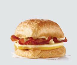 A fresh-cracked grade A egg and Applewood smoked bacon covered in creamy Swiss cheese sauce on a flaky croissant bun. Breakfast basics worth waking up early for